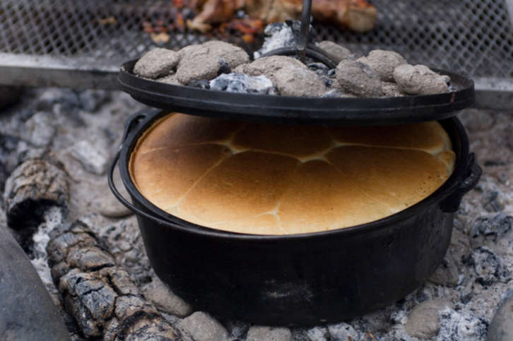 Place your baking pan into a shallow area in your fire pit (not directly on the flames, but close enough to keep a steady heat on your pan. I like to line the bottom of this area with some hot stones, place my pan inside and cover it and then put more stones on top.